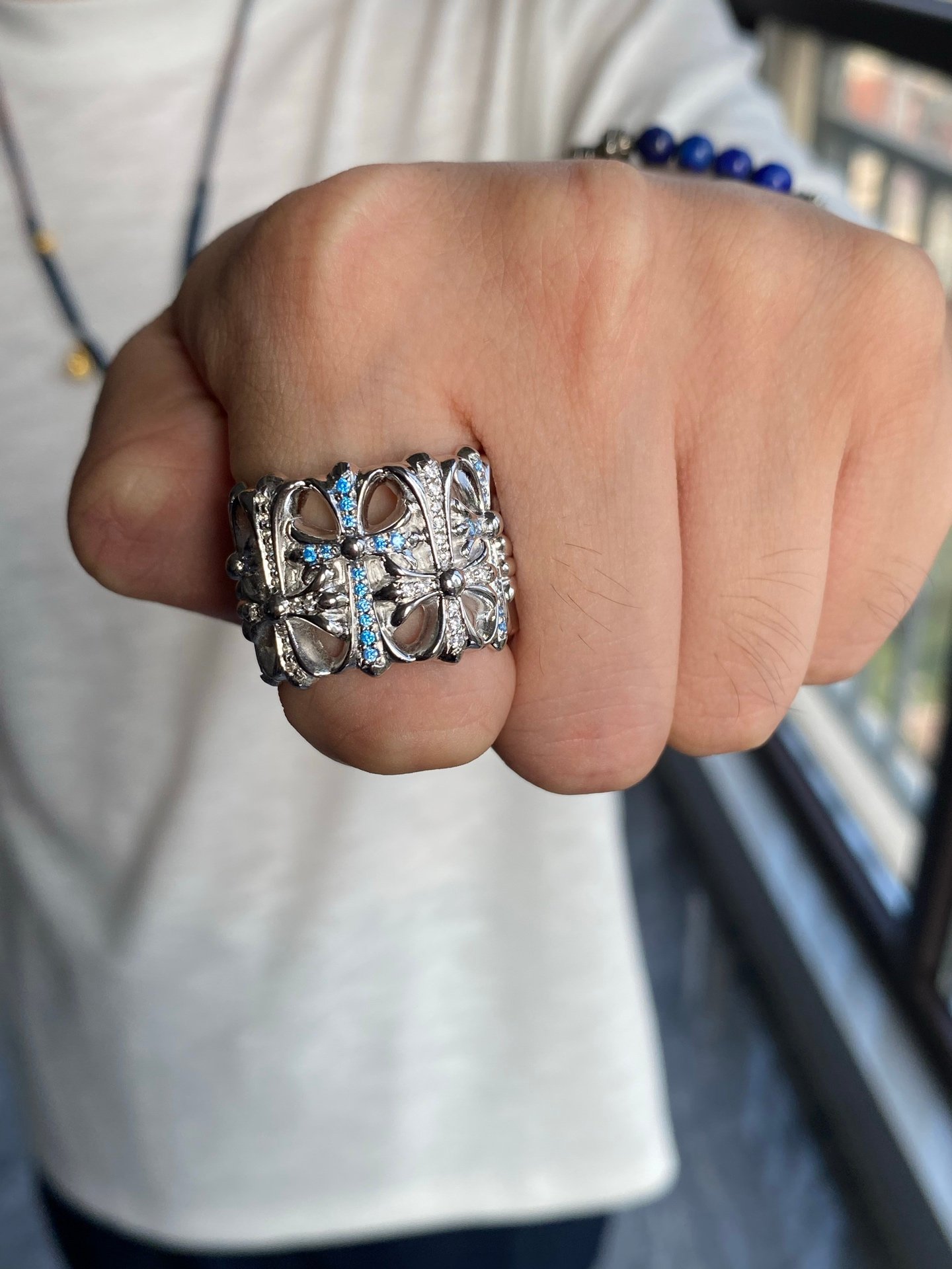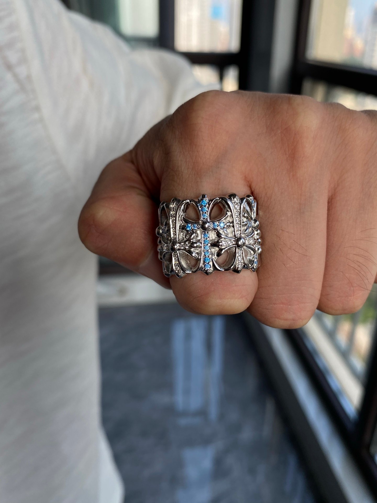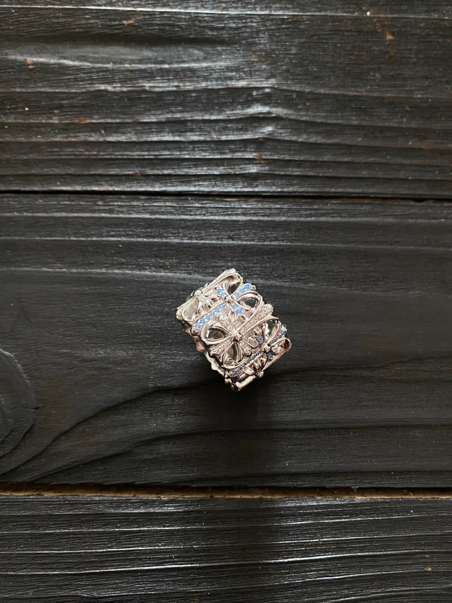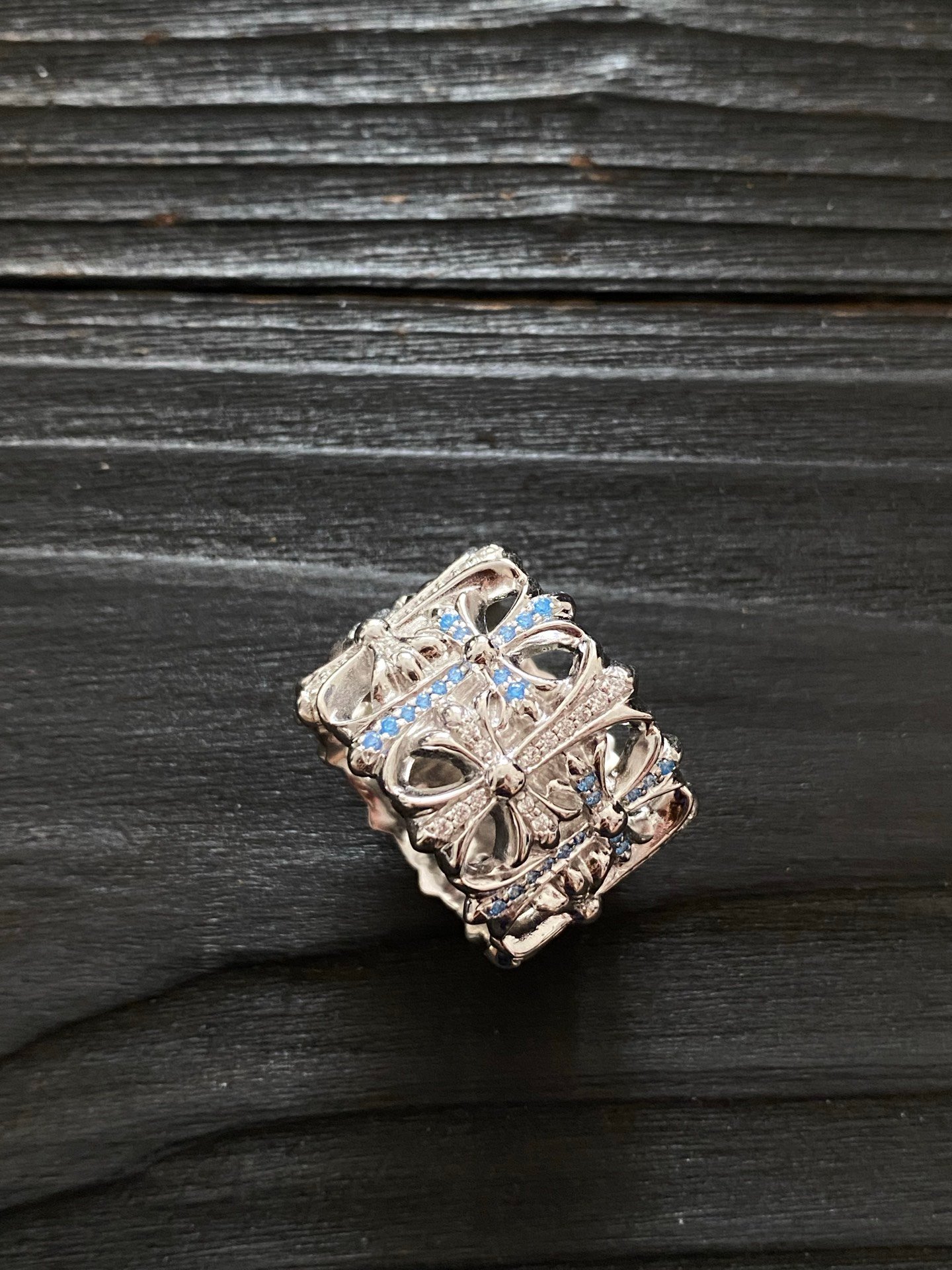 クロムハーツ プラチナメッキ ブルー & ホワイトダイヤ交互镶嵌 セメタリー リング