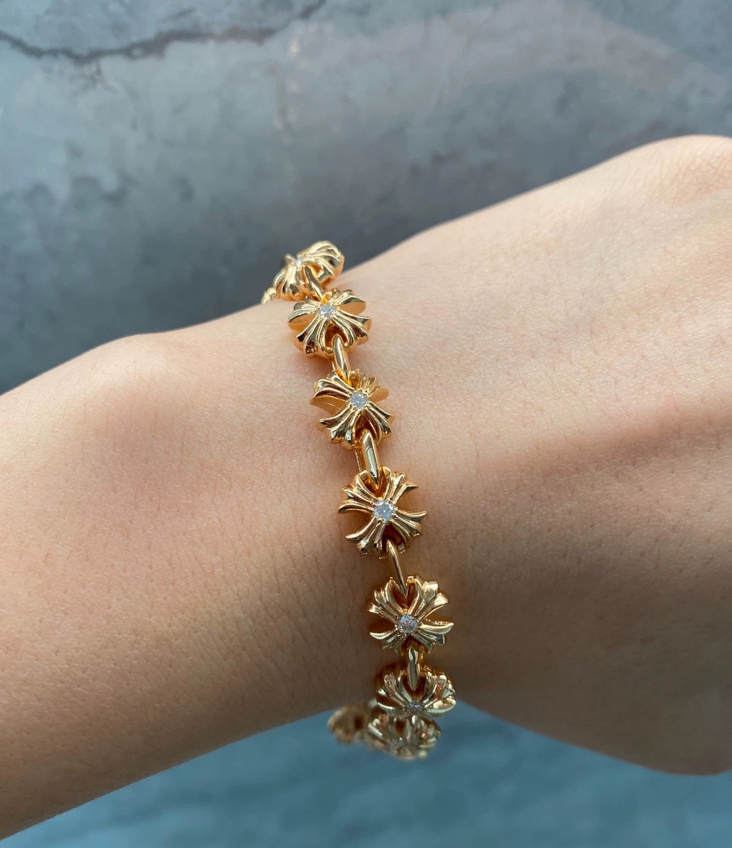 クロムハーツ 925 シルバー ゴールドメッキ モアッサナイト クロスフラワー Plus ブレスレット
