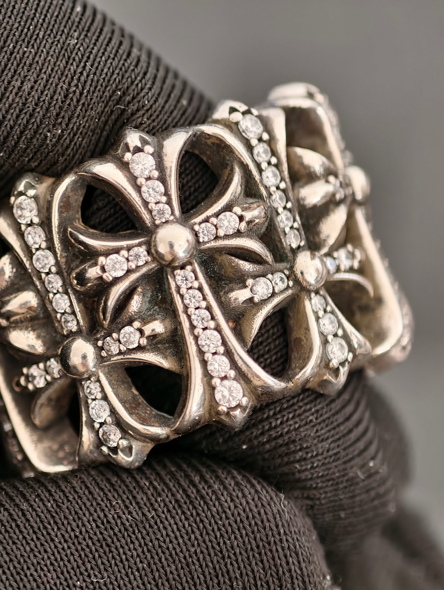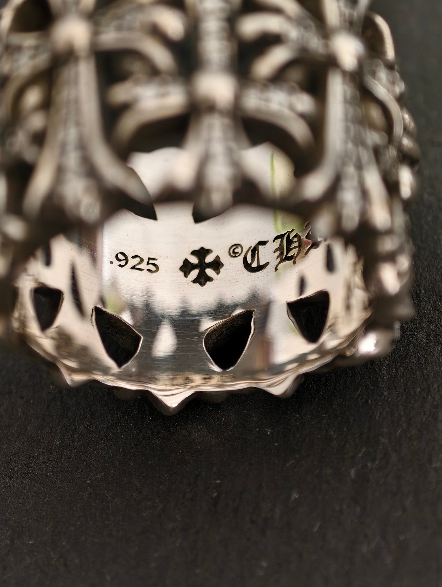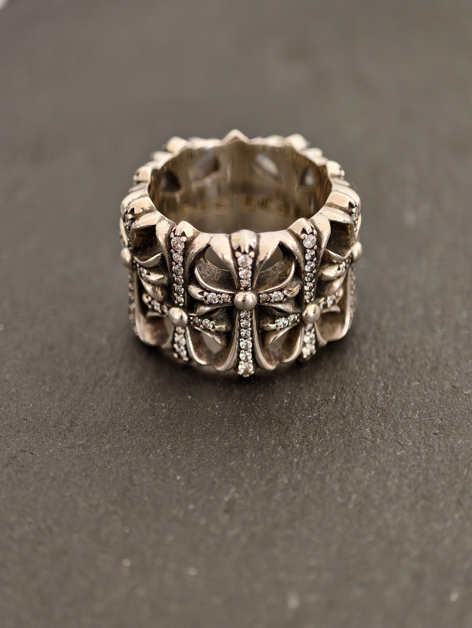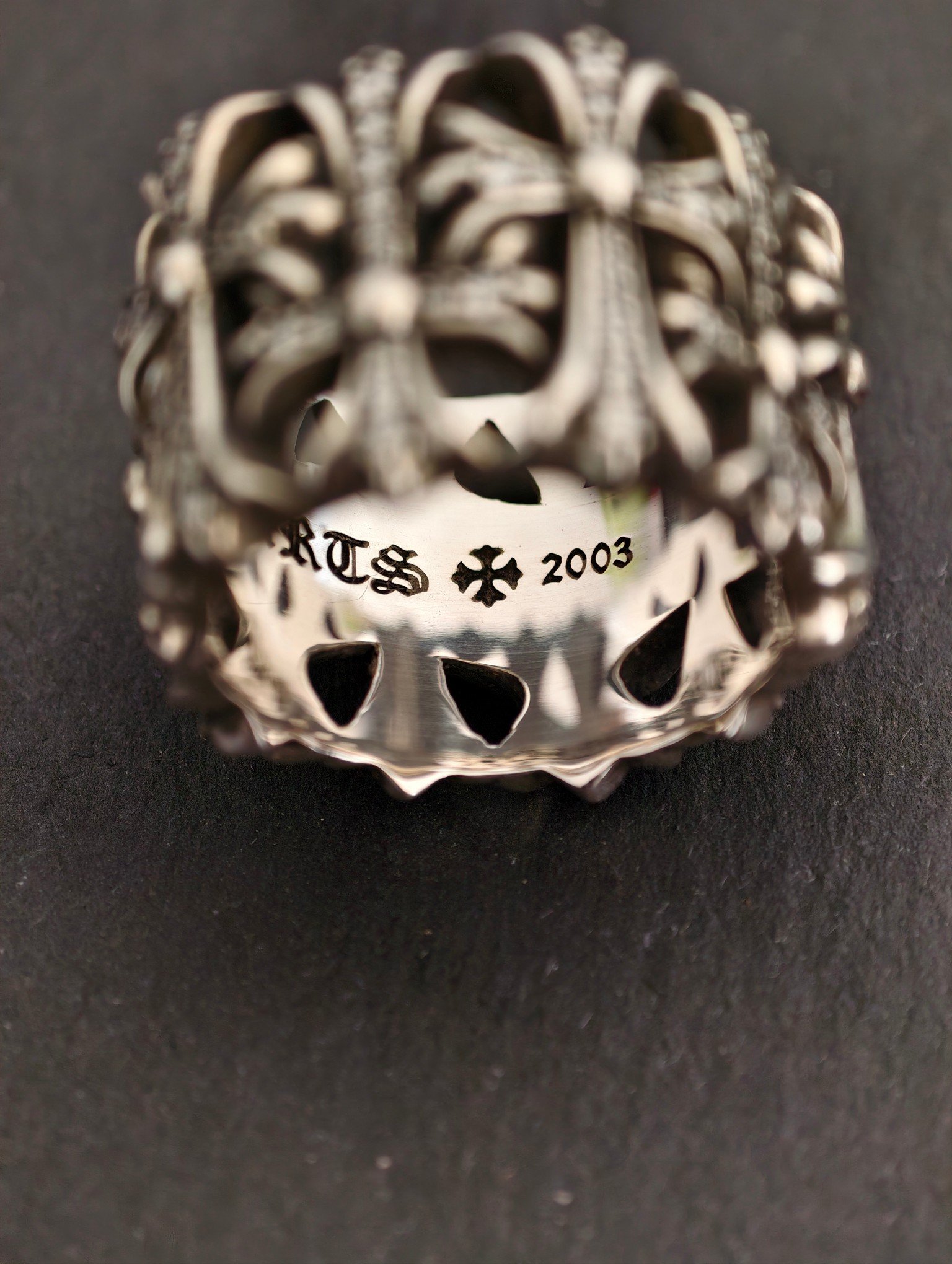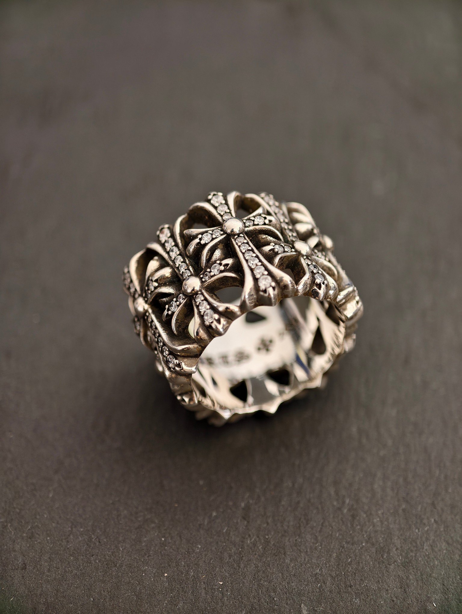 クロムハーツ 宝石込み 円形墓守リング,宝石付き墓十字リング、ブラックメッキ処理により模様が鮮明に見え、ディテールが緻密